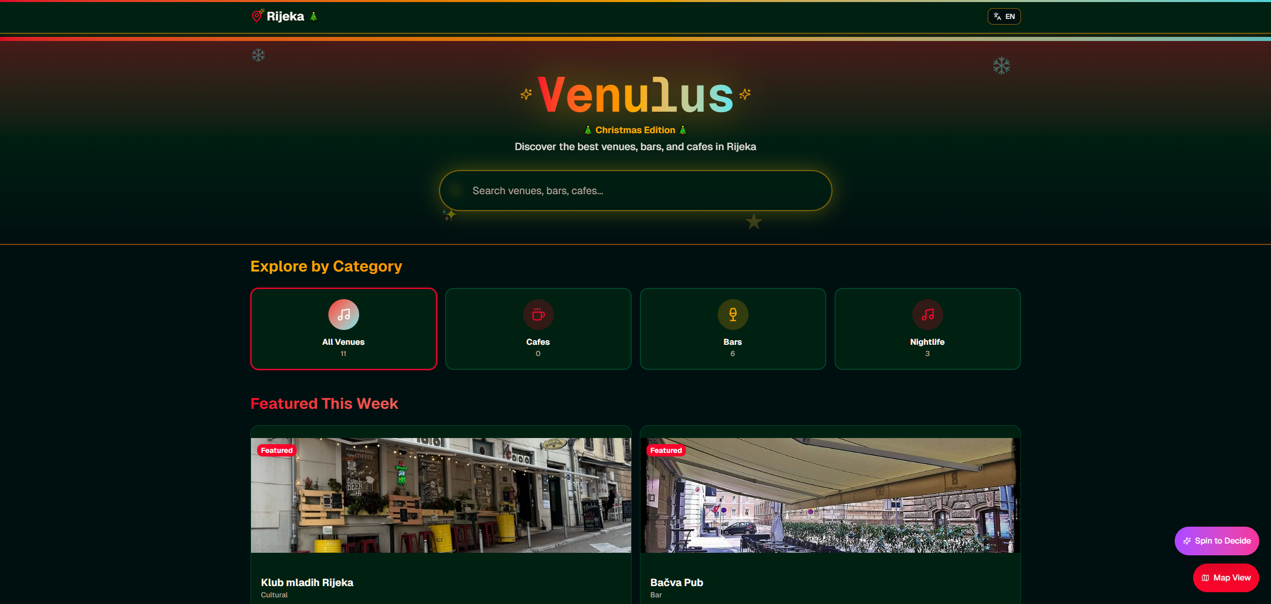 Platforma za otkrivanje najboljih mjesta u Rijeci. Venulus povezuje ljude s najboljim barovima, klubovima i kulturnim centrima u gradu. Projekt uključuje interaktivnu kartu, sustav preporuka, pretragu po kategorijama i detaljne informacije o svakom mjestu.